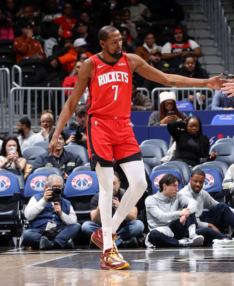 比赛中,杜兰特上脚华盛顿指挥官配色Nike KD18“Washington Commanders”PE,配色灵感来自杜兰特家乡球队NFL指挥官队的队服颜色。