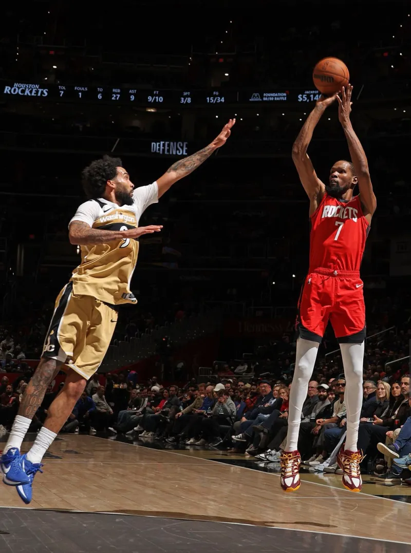 本场比赛,火箭队球员凯文-杜兰特出战37分钟,投篮15中8,三分球6中3,罚球11中11,得到30分7篮板1助攻1盖帽。